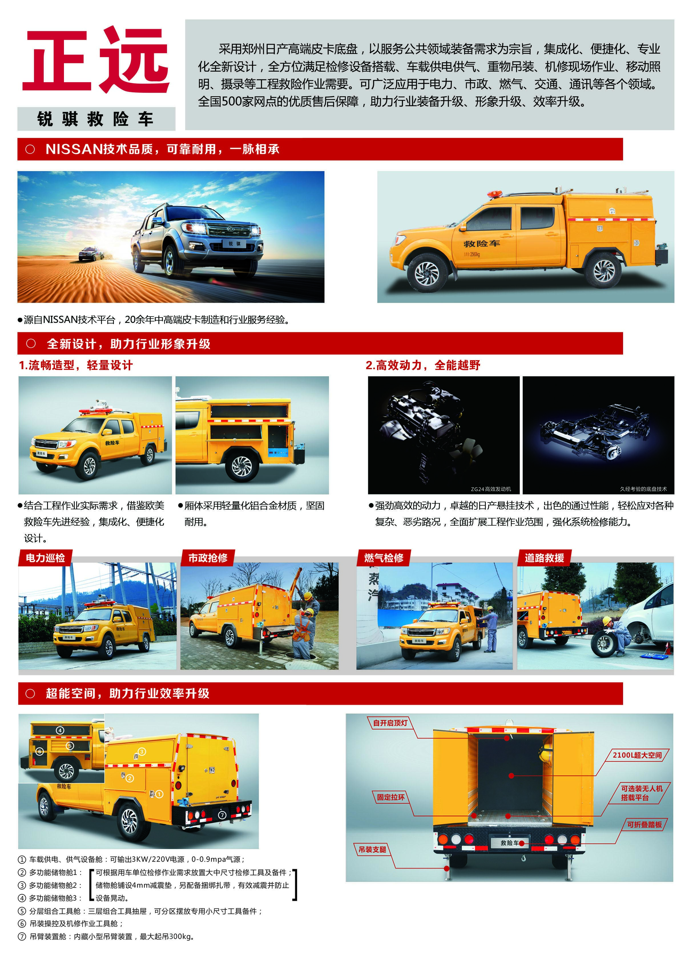 正遠牌銳騏救險車采用鄭州日產(chǎn)高端皮卡底盤,以服務(wù)公共領(lǐng)域裝備需求為宗旨,集成化、便捷化、專業(yè)化的設(shè)計可廣泛運