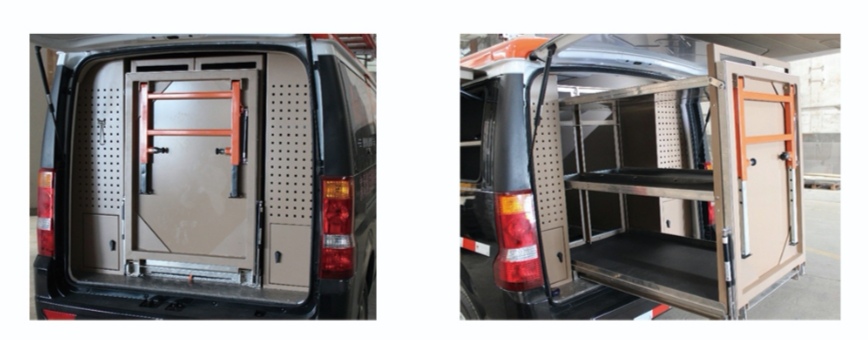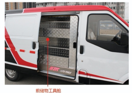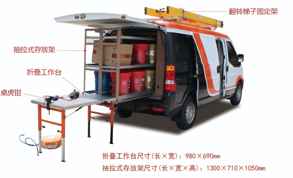 檢修車裝備有外開式側工具柜、抽拉式存放架、折疊工作臺和桌虎鉗??蛇x裝翻轉梯子固定架、5M絕緣梯、前混合動力倉、前儲物工具倉、氣鼓及移動線盤。方便作業(yè)人員取放各類工具,提升作業(yè)效率。