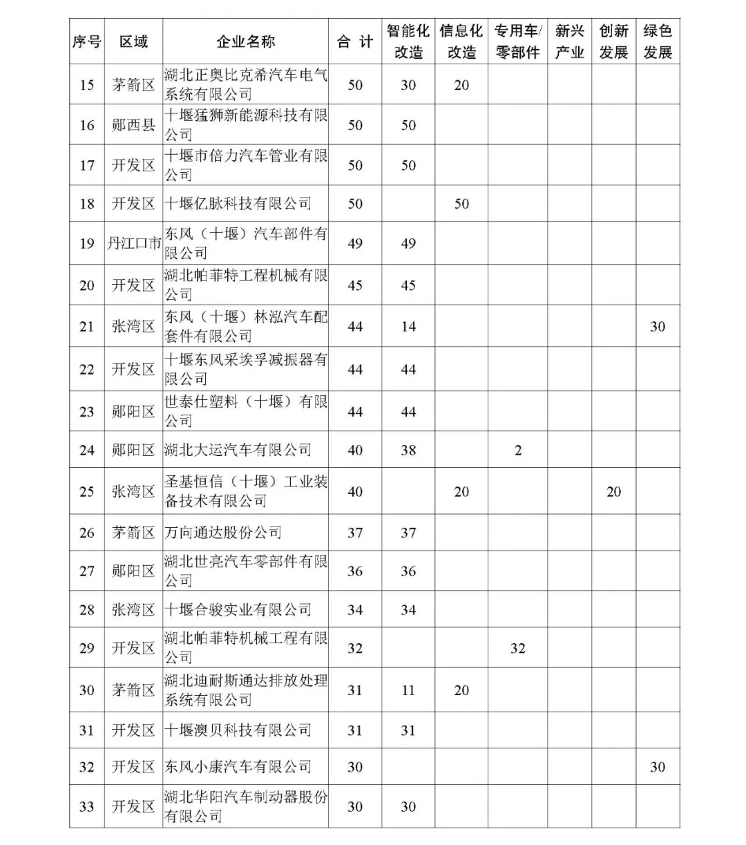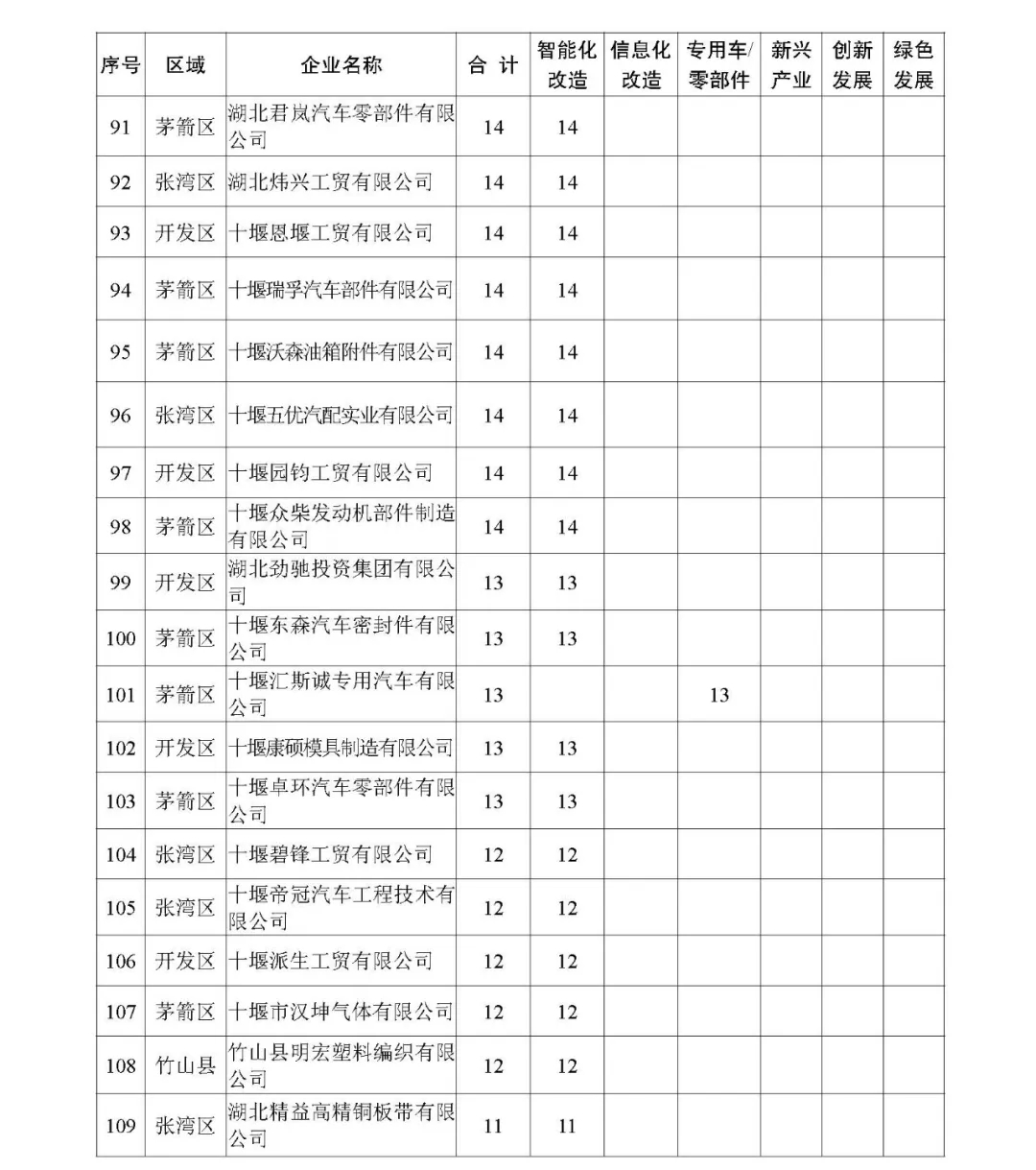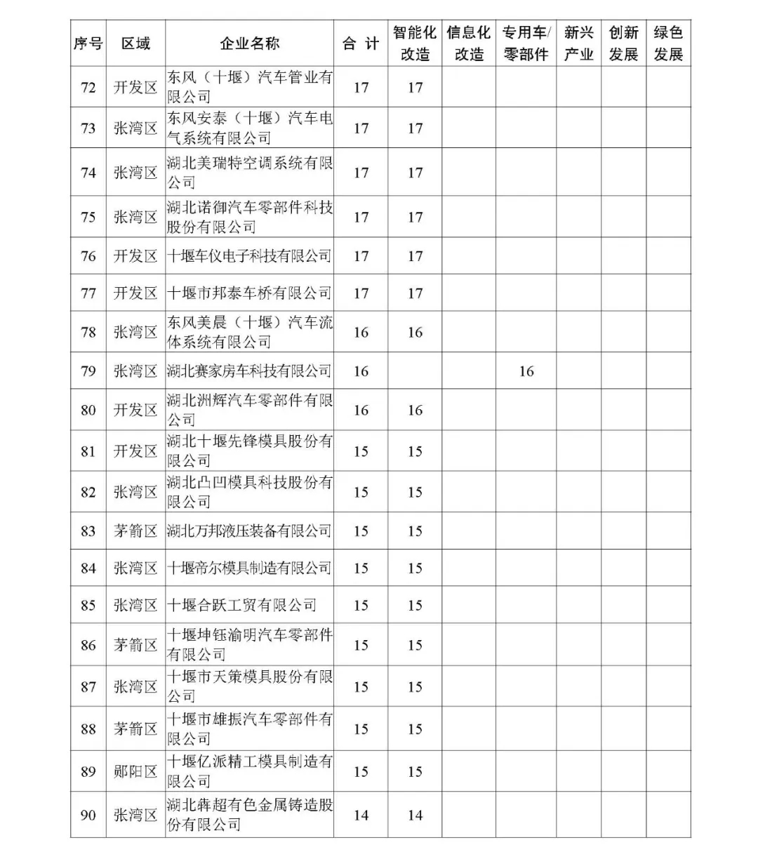 十堰聯(lián)瑞工貿(mào)有限公司、十堰擎邦機(jī)械設(shè)備有限公司、湖北笛奧工貿(mào)有限公司、十堰市博利汽車零部件有限公司、十堰達(dá)大盛工貿(mào)有限公司、湖北西卡達(dá)工貿(mào)有限公司、壹緯度新能源汽車(湖北)有限公司、十堰弘洺工貿(mào)有限公司、湖北釘釘汽車配件有限公司、湖北秀山智能科技股份有限公司、湖北鑫振亞實(shí)業(yè)有限公司、派恩(十堰)汽車空調(diào)有限公司、十堰衡豐工貿(mào)有限公司、湖北藍(lán)鳥工貿(mào)有限公司、十堰山特工貿(mào)有限公司、湖北峰辰工貿(mào)有限公司、湖北松港汽車科技有限公司。