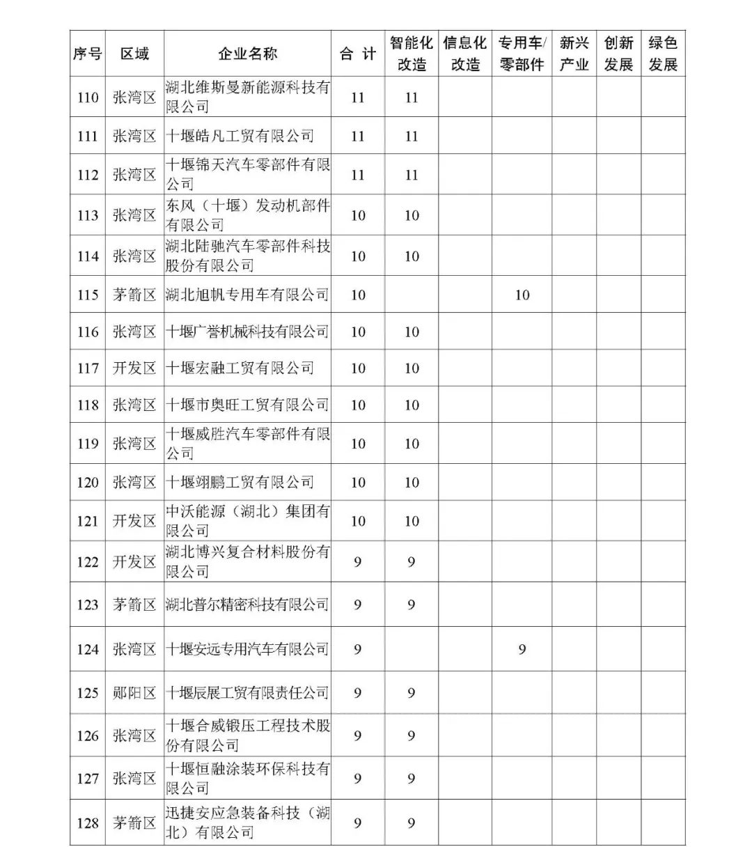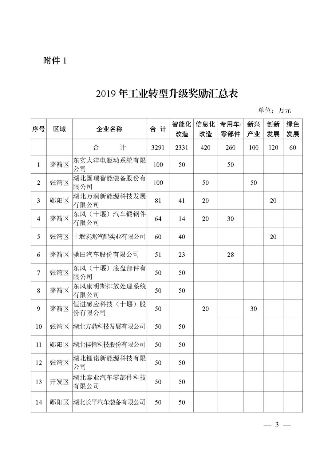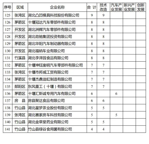 為進(jìn)一步鼓勵引導(dǎo)全市工業(yè)轉(zhuǎn)型升級,創(chuàng)新發(fā)展,推動全市工業(yè)經(jīng)濟(jì)、商務(wù)經(jīng)濟(jì)再上新臺階,經(jīng)研究,決定授予十堰市倍力汽車管業(yè)有限公司等124家企業(yè)技術(shù)改造投資獎;授予湖北帕菲特機(jī)械工程有限公司等15家企業(yè)汽車產(chǎn)業(yè)發(fā)展獎;授予湖北國瑞智能裝備股份有限公司等3家企業(yè)新興產(chǎn)業(yè)發(fā)展獎;授予圣基恒信(十堰)工業(yè)裝備技術(shù)有限公司等6家企業(yè)創(chuàng)新發(fā)展獎;授予東風(fēng)(十堰)林泓汽車配套件有限公司等2家企業(yè)綠色發(fā)展獎;授予竹溪縣等5家單位“利用外資先進(jìn)單位”榮譽(yù)稱號;授予張灣區(qū)等52家單位和企業(yè)“外貿(mào)出口先進(jìn)單位”榮譽(yù)稱號;授予張灣區(qū)商務(wù)局等37家單位和企業(yè)“國內(nèi)貿(mào)易先進(jìn)單位”榮譽(yù)稱號,并予以通報(bào)表揚(yáng)獎勵。