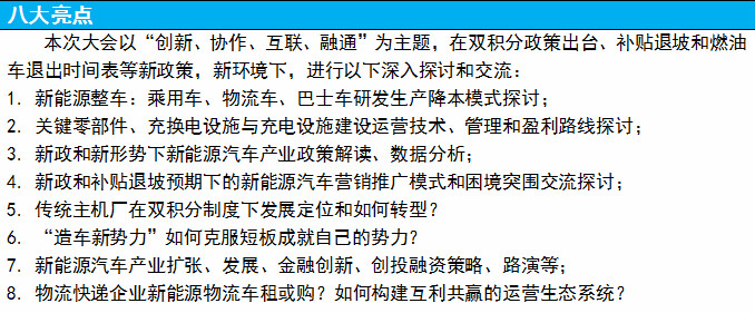 2018中國(南京)新能源汽車產(chǎn)業(yè)高峰論壇由“第二屆中國新能源汽車產(chǎn)業(yè)技術(shù)總工高峰會(huì)、第二屆中國新能源汽車運(yùn)營商與車企對(duì)接采購交流大會(huì)、第二屆中國新能源汽車租賃運(yùn)營管理與互聯(lián)高峰論壇、中國新能源汽車產(chǎn)業(yè)金融與創(chuàng)業(yè)投資峰會(huì)、“中工影響力”中國新能源汽車產(chǎn)業(yè)年度行業(yè)最佳評(píng)選活動(dòng)、新能源汽車整車與零部件展覽會(huì)”等活動(dòng)組成,本次大會(huì)由工業(yè)和信息化系統(tǒng)直屬協(xié)會(huì)中國電子節(jié)能技術(shù)協(xié)會(huì)、全國新能源與節(jié)能汽車產(chǎn)業(yè)委員會(huì)、中工汽車網(wǎng)聯(lián)合打造的中國新能源汽車行業(yè)頂級(jí)盛會(huì)。