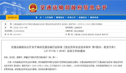 為進(jìn)一步加強(qiáng)營(yíng)運(yùn)貨車(chē)安全技術(shù)管理,有效遏制因車(chē)輛安全性能不足導(dǎo)致的運(yùn)輸安全事故,交通運(yùn)輸部制定發(fā)布了交通運(yùn)輸行業(yè)標(biāo)準(zhǔn)《營(yíng)運(yùn)貨車(chē)安全技術(shù)條件 第1部分:載貨汽車(chē)》(JT/T 1178.1—2018,以下統(tǒng)稱(chēng)JT/T 1178.1標(biāo)準(zhǔn)),2018年5月1日起正式實(shí)施。為積極穩(wěn)妥做好JT/T 1178.1標(biāo)準(zhǔn)的貫徹實(shí)施,抓好營(yíng)運(yùn)貨車(chē)安全技術(shù)管理,現(xiàn)將有關(guān)事項(xiàng)通知如下。