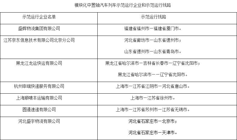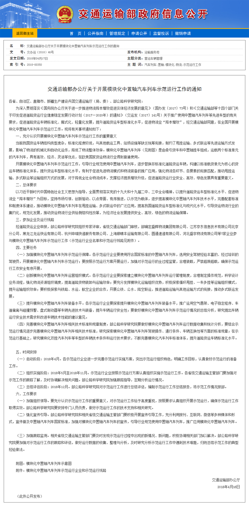 經(jīng)濟(jì)日報(bào)-中國商用汽車網(wǎng)4月18日訊 4月17日,交通運(yùn)輸部發(fā)布了《關(guān)于開展模塊化中置軸汽車列車示范運(yùn)行工作的通知》(以下簡稱:《通知》)。《通知》要求,2018年5月至2018年11月的示范運(yùn)行組織實(shí)施階段中,七家示范運(yùn)行企業(yè)在10條示范運(yùn)行線路上,采用模塊化的中置軸汽車列車,進(jìn)行示范運(yùn)營。