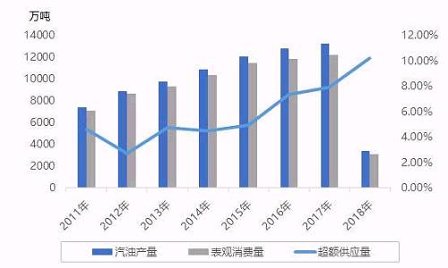 據(jù)中宇資訊統(tǒng)計(jì)數(shù)據(jù)顯示,2018年1-3月份我國(guó)汽油產(chǎn)量為3434萬(wàn)噸,而表現(xiàn)消費(fèi)總量為3082萬(wàn)噸,超額供應(yīng)量達(dá)到10.25%,由上圖走勢(shì)圖中可以看出,2012年開(kāi)始,我國(guó)汽油產(chǎn)量及表觀消費(fèi)量雙雙增長(zhǎng),但整體處于供大于求的局面,且過(guò)剩情況連年走高。